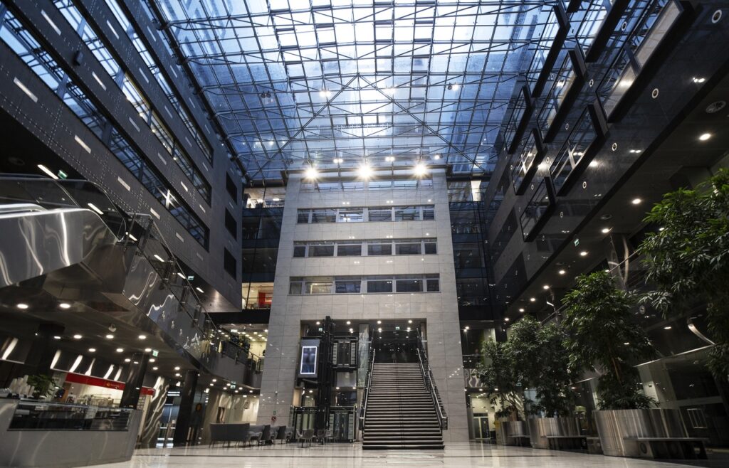 W budynku Focus wewnętrzne atrium połączone z ogrodem zimowym z widokiem na Pole Mokotowskie