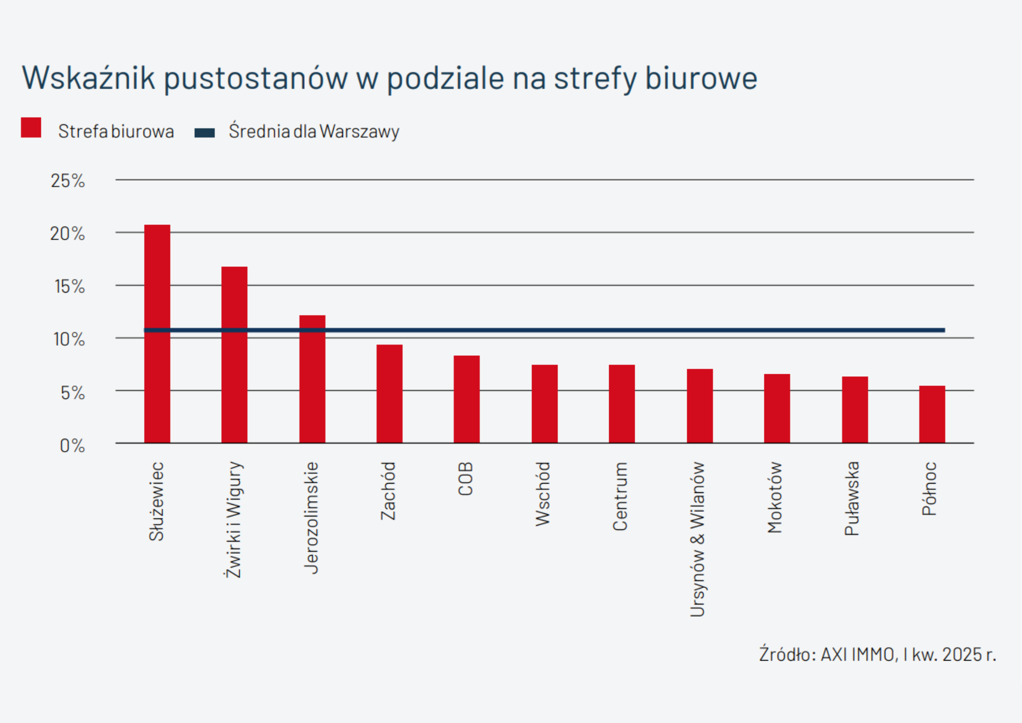 Wskaźnik pustostanów na warszawskim rynku biurowym wyniósł 10,5%, co oznacza spadek o 0,5 p. p. względem analogicznego okresu roku poprzedniego. Najniższy poziom dostępnej powierzchni biurowej odnotowano w strefach centralnych – 7,4%, natomiast poza centrum wskaźnik ten wyniósł 13,0%. Najwyższy poziom pustostanów utrzymuje się na Służewcu, gdzie na koniec kwartału osiągnął wartość 20,4%.