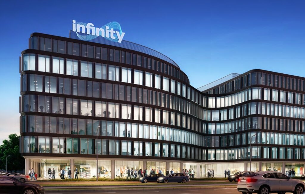 Infinity is a modern class A office building located in the very center of the city, on the main thoroughfare leading from the Market Square to the Wroclaw Motorway Ring Road. It has 7 floors above ground and almost 20,000 sqm of office space. It is distinguished by the unusual shape of its body with a wavy facade and indentation. Rhythmic divisions on the glass facade create a timeless character of the building. The representative architecture and location on a several-lane roadway make the building recognizable and perfectly exposed. It offers attractive office space and retail and service premises on the first floor. The high standard of finishes, the use of environmentally friendly solutions confirmed by the BREEAM Excellent certificate, the possibility of flexible space arrangement and optimal access to daylight ensure comfortable working conditions. Tenants have at their disposal roof terraces overlooking the city skyline and underground parking spaces with infrastructure for cyclists