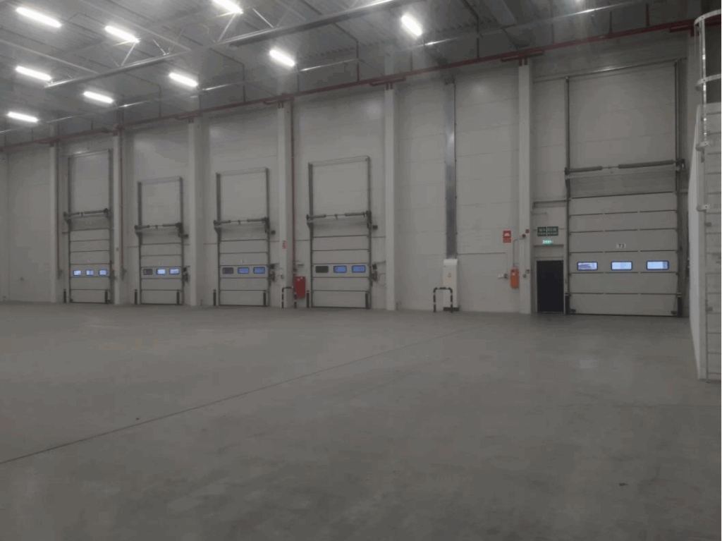 High storage warehouse in the valued, among others by location logistics and courier companies Unloading docks Entry gates on the "0" level Fire protections ESFR Sprinklers Smoke vents