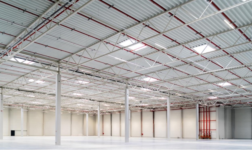 Warehouse space with LED lighting, and also lit by daylight through skylights