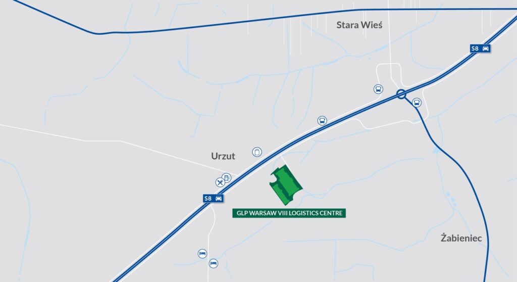 A modern warehouse park is located in Nadarzyn, right next to the S8 expressway, 16 km from the entrance to the A2 motorway, which leads westward toward the German border. The S7 expressway, 17 km away from the park, is part of the European routes E28 and E77, connecting the Tricity, Warsaw, Kielce, and Kraków metropolitan areas.The location of the facility near Warsaw offers excellent logistics and distribution conditions within the city, region, and country.The site also provides access to a qualified workforce.