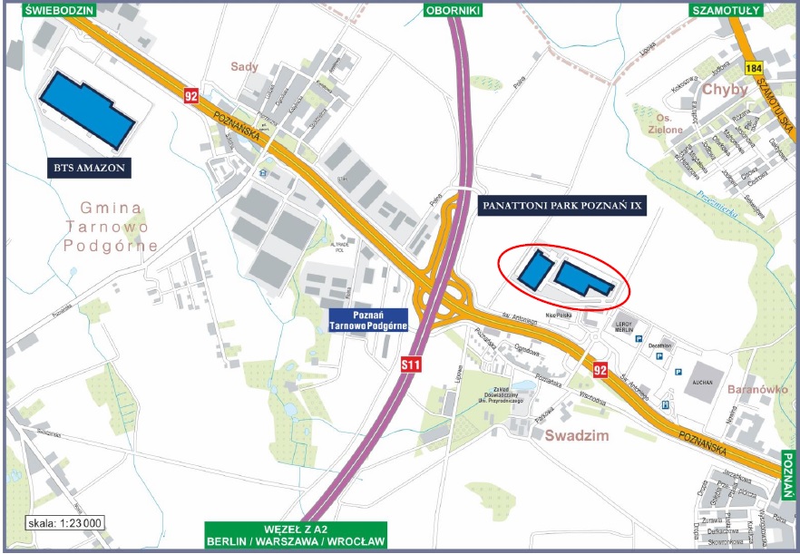 The Panattoni Park Poznań IX distribution’s centre is located Western Bypass of city-centre of Poznań; Property is located in the Swadzim near Tarnowo Podgórne (wielkopolskie voivodship); Only 14 km to the centre of Poznań; The complex is located a short distance from the intersection of the S11 expressway with the national road No. 92; The location enables quick access to the A2 motorway, which is one of the main routes for logistics in Poland. The motorway enables fast transport of goods to Germany and further Western European countries and in the opposite direction leads to the border with Belarus; Location Panattoni Park Poznań IX provides good transport links both to the centre of Poznan and further parts of the country, including a direct connection with Warsaw, Łódź, where it crosses the A1 motorway (north-south), providing further quick and easy connection with other major cities in Poland; Easy access to qualified staff.