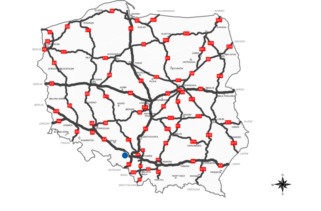 Distances:A1/A4 -3 km Katowice - 25 km Warsaw - 300 km Wroclaw - 150 km Vienna - 350 km Prague - 450 km Berlin - 500 km