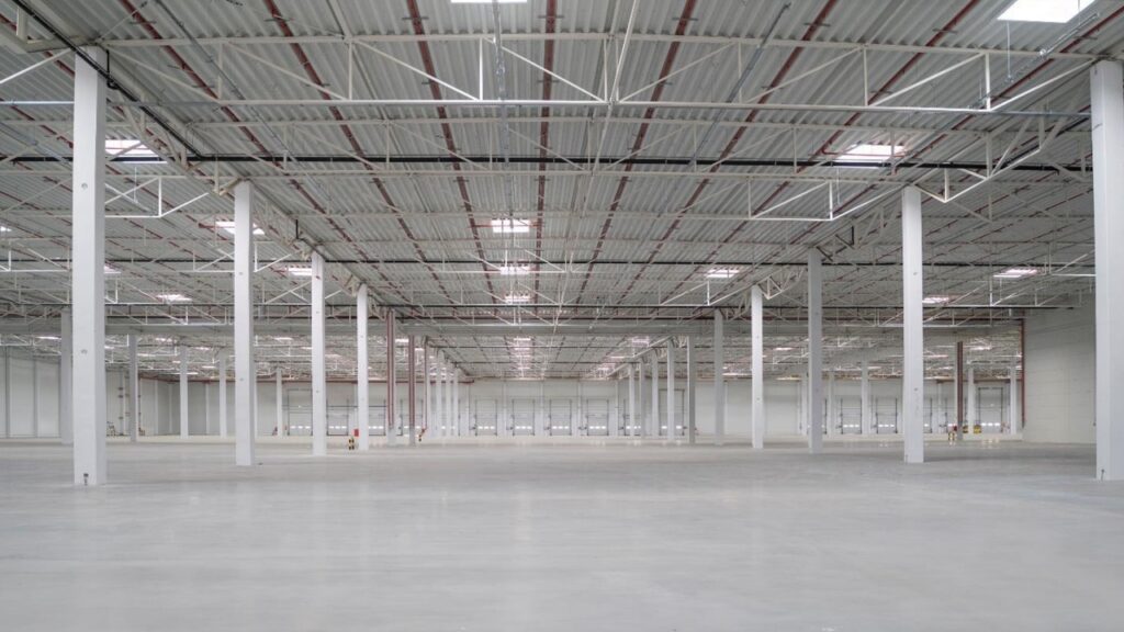 siatka słupów w 12 x 22,5 m, wysokość składowania 12 m, posadzkę bezpyłową o nośności 5 T / mkw., instalację tryskaczową oraz wymagane wyposażenie PPOŻ, energooszczędne oświetlenie LED, docki z ochronnymi kołnierzami i hydraulicznymi podnośnikami, bramy z poziomu "0"