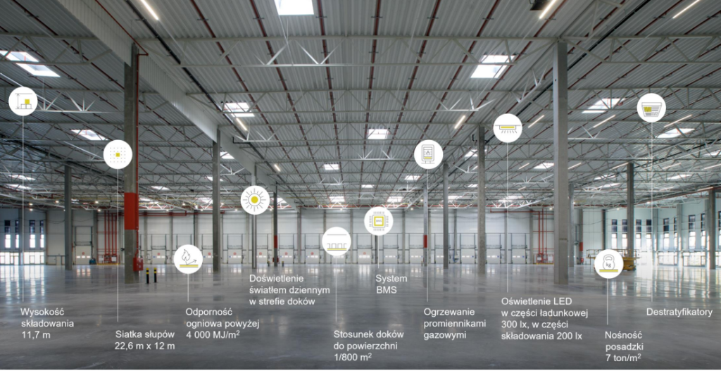 Obiekt spełnia wymagania najbardziej wymagających klientów:• Budynek klasy A+ • Ogrzewanie zapewniające temperaturę + 15⁰C przy temperaturze zewnętrznej -20⁰C • Obciążenie ogniowe powyżej 4 000 MJ/m2 • Posadzka o nośności 7T/m2 • Wysokość hali netto 10 m • Siatka słupów 12m x 22,6m • Dostęp przez doki i bramy z poziomu 0 • Miejsca parkingowe