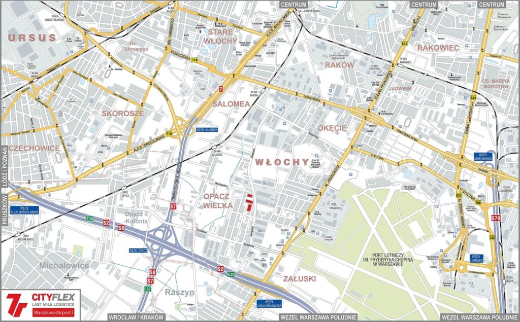 → Warszawa Włochy – magazyny i hale położone blisko lotniska Chopina oraz węzłów komunikacyjnych, z szybkim dostępem do autostrady A2 i drogi ekspresowej S79, co sprzyja efektywnej logistyce krajowej i międzynarodowej. Największe skupiska nowoczesnych magazynów klasy A znajdują się w rejonie Okęcia oraz Al. Jerozolimskich. Dzielnica Włochy to kluczowa lokalizacja na rynku magazynowym Warszawy, oferująca powierzchnie magazynowe do wynajęcia dostosowane do potrzeb firm działających na rynku e-commerce i FMCG.